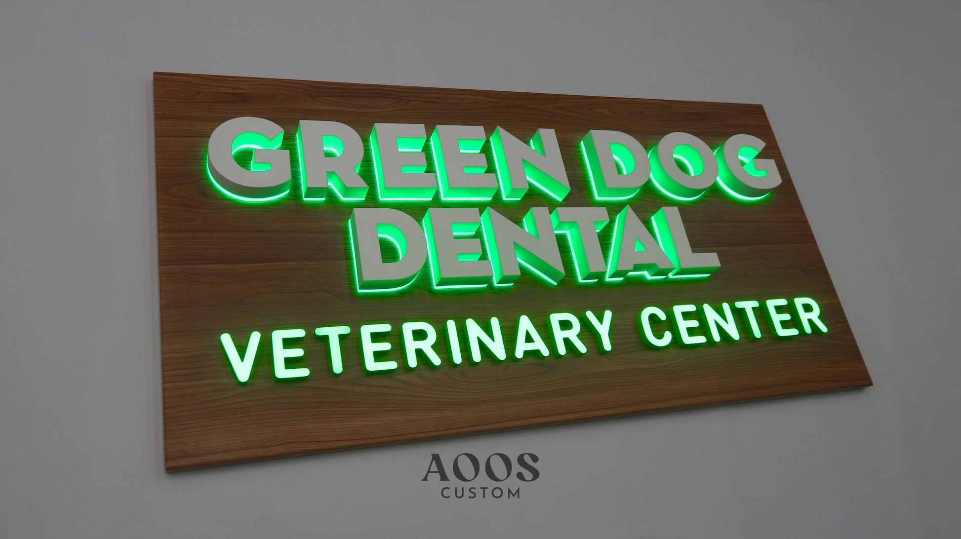 Custom LED Backlit Letters, Halo Lit Illuminated Metal Sign With Backlight, Mounted on Wood-Grain Backing