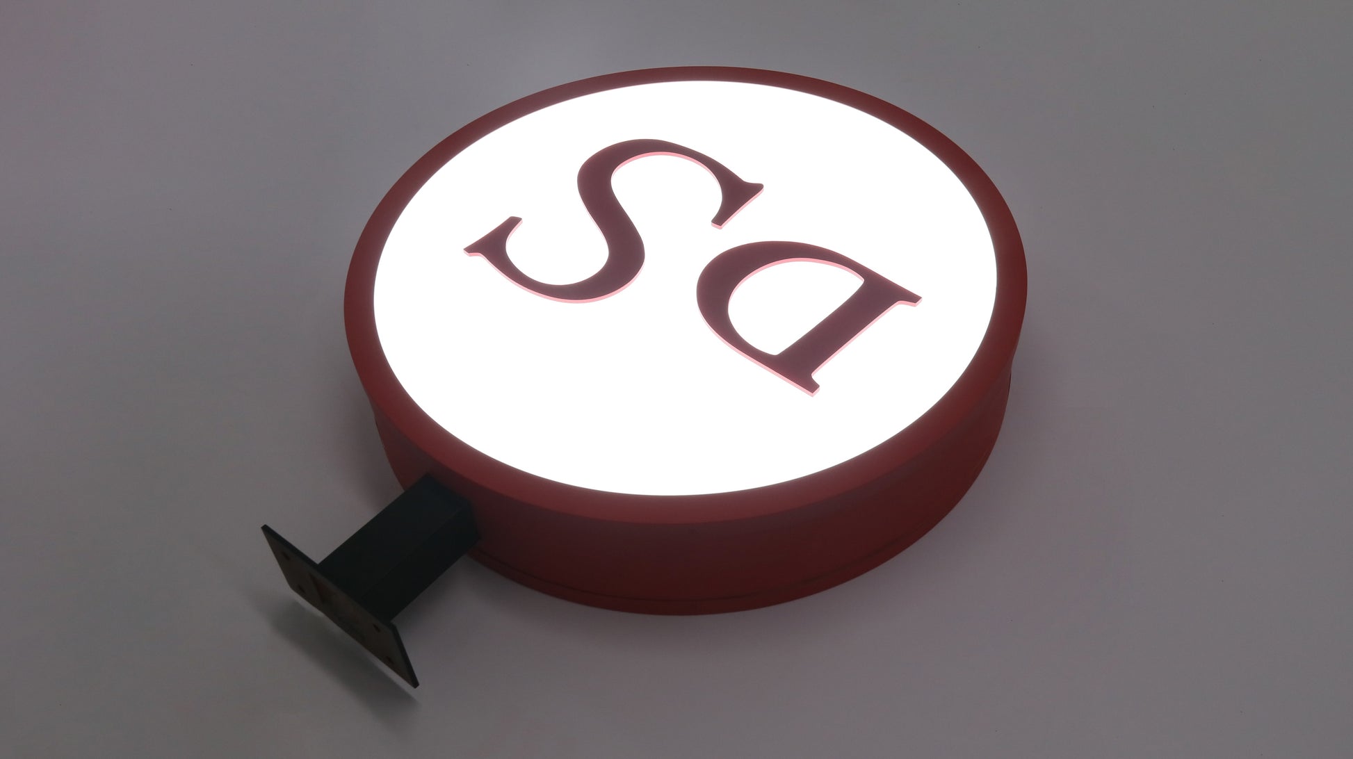 The smooth circular face provides a modern, polished surface for displaying logos, initials, or business graphics. Both sides light up evenly with a soft, uniform glow, giving shops, cafés, restaurants, and small businesses a clear and attractive branding display day and night.